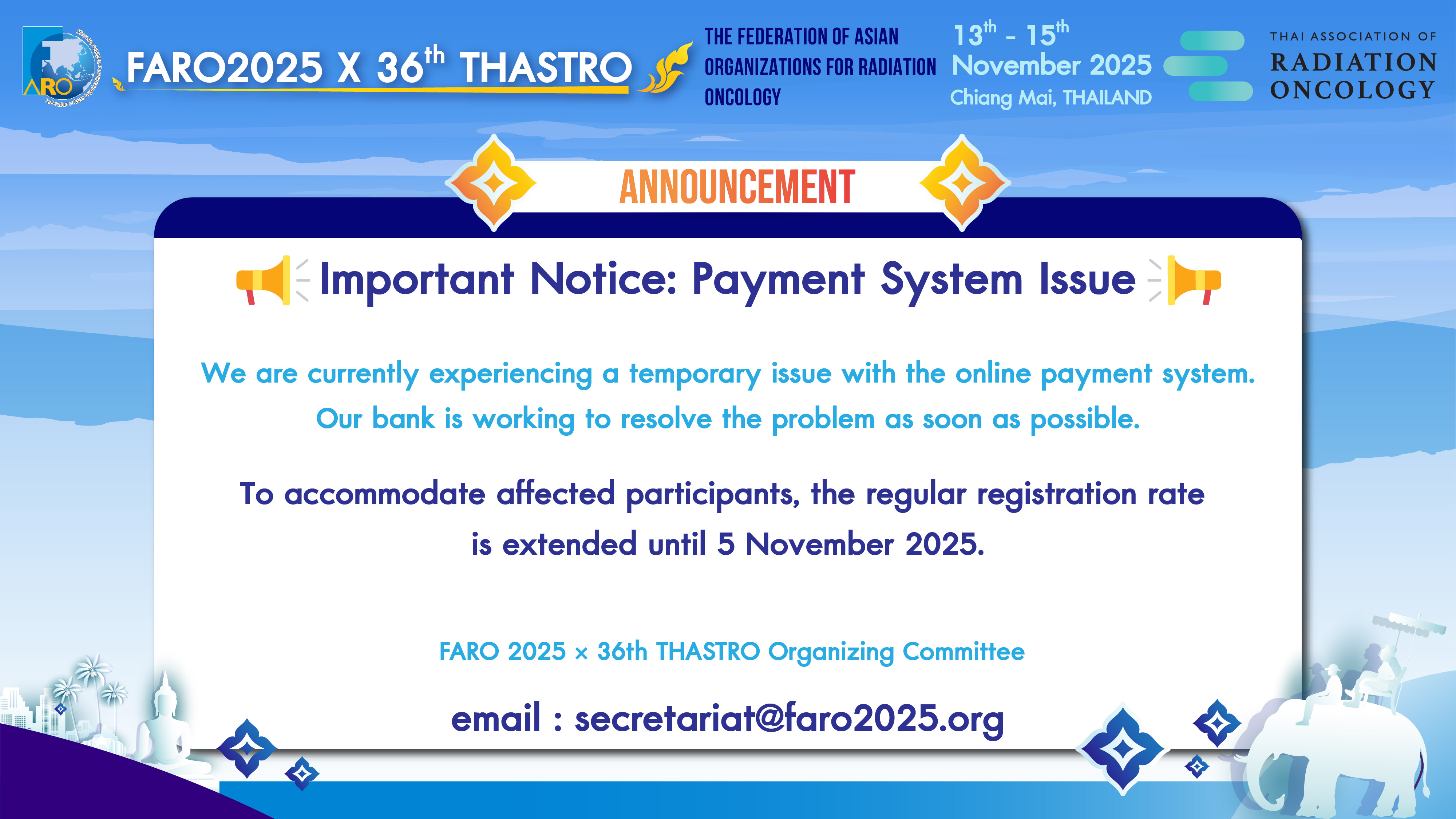 We are delighted that Thai Association of Radiation Oncology (THASTRO) will be hosting the 7th Federation of Asian Organizations for Radiation Oncology (FARO) meeting jointly with the 36th THASTRO annual meeting from 13th to 15th November 2025 at The Empress Convention Center, Chiang Mai, Thailand.